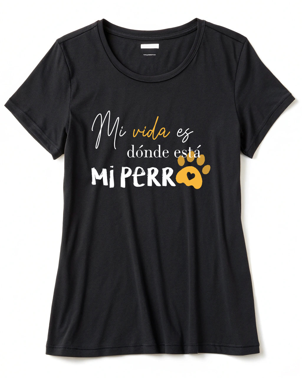 Luce tu amor perruno con estilo con esta camiseta blanca de manga corta. Su diseño divertido y entrañable lleva la frase “Mi vida es donde está mi perro” acompañada de detalles en rojo que transmiten ternura y pasión por tu mascota.